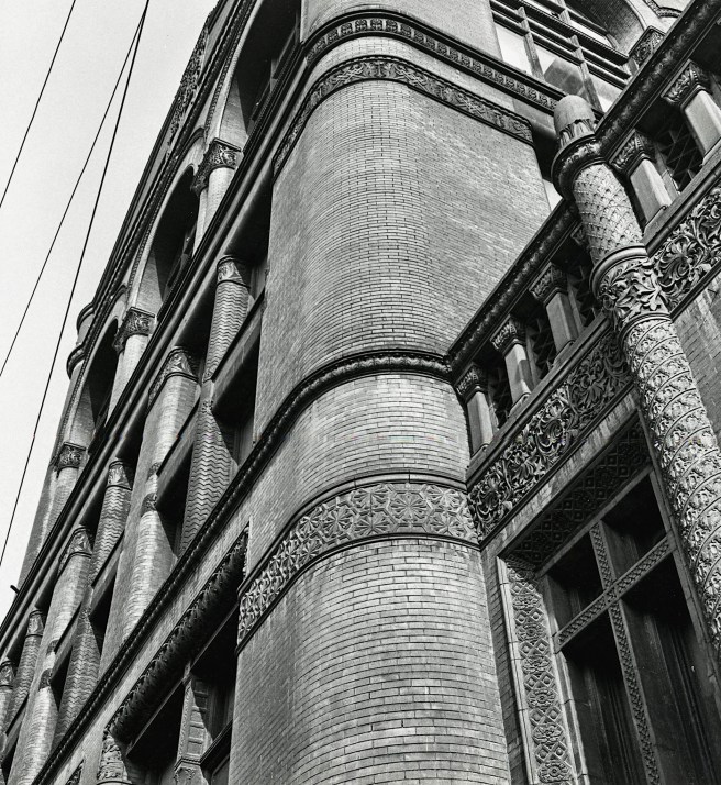 The final detailing of the brick and terra cotta exterior was again, a tour de force in clay. Root consciously modeled the building as a three-dimensional form in masonry. He expressed the mass of the masonry by pushing the windows as far back as he could so one could actually see the wall’s thickness (in contrast to the Midland Hotel) and emphasized its mass by curving every corner. There were no sharp 90° corners that resulted in planes in this building; it was mass, true plastic mass, through and through.