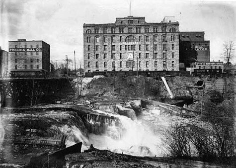 The regional economy was fleshed out with the addition of Minneapolis that was built on a branch of the Mississippi at the Falls of St. Anthony, the only cataract on the river. The 25-foot drop in the river elevation at this location provided the largest source of waterpower in the Midwest. All one had to do to harness this potential was to divert a portion of the upper river with a channel to a waterpit that dropped to the lower level downriver and place a waterwheel in the pit, nature could then grind wheat or saw timber. Two of the Northwest’s natural resources, wheat and timber, that had been central to Chicago’s regional dominance during its initial growth in the mid-nineteenth century, could now be processed less expensively closer to their source and transported directly to market, completely bypassing Chicago. By the mid-1880s, Minneapolis was home to the largest flour-milling complex in the country, with over 25 flourmills and their accompanying storage elevators on the west shore of the falls, that was complemented by a large concentration of sawmills that were originally built on the opposite shore. The period 1880 to 1890 would be known as the “Minneapolis Boom.” In 1880, the city’s population was 46,887, by 1890 it had grown to 164,738, which represented a 250% increase in population during the decade.