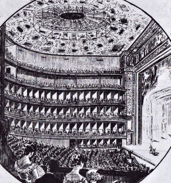 Therefore, Peck had directed Adler to copy Cincinnati’s Music Hall and eliminate all private boxes, as Edward Garczynski recorded in his 1890 book, The Auditorium: “for [Peck] had no belief in privileged classes, and regards the Metropolitan Opera of New York, where the whole structure is sacrificed to the boxes, with infinite scorn and patriotic dislike. This was a repetition of effete European ideas, and if there was one thing he impressed upon the architects, it was that he wanted the Auditorium to represent the present and future and not the corrupted past.” Peck’s objective could not have been more diametrically opposed to the goals of Alva Vanderbilt in her single-minded desire to erect an opera house with as many private boxes as the rich could afford (see Vol. 3, Sec. 10.9.). Peck’s design requirement was one of the reasons for the theater’s non-traditional appearance. Instead of consisting of concentric layers of private boxes like the Met or the great European Opera Houses, the Auditorium would be a vast sea of 4237 individual seats: Peck’s vision of “democracy.” (A significant number of major stockowners, however, refused to go along with such a radical plan and forced Peck to incorporate a small number (twenty in two tiers on each side) boxes that would, indeed, showcase Chicago “leading citizens.”)