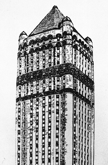 Buffington’s design for the exterior of the Cloudscraper revealed the influence of Richardson. Historian Dimitri Tselos was one of the first to identify Its resemblance to the tower in the Allegheny County Courthouse: the corners of the tower have an engaged round turret that was topped with its own conical roof, and even the tower was capped with a pyramidal roof. It was once believed that the design was by Harvey Ellis, an itinerant architect/renderer who had been hired by Buffington in 1886 to produce a number of competition drawings. This was based on the thought that Ellis had once worked for Richardson, and hence, the direct linkage with Richardson’s work, but recent scholarship has since argued that there is no record of Ellis’ employment in the Richardson office records.