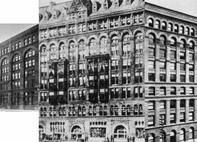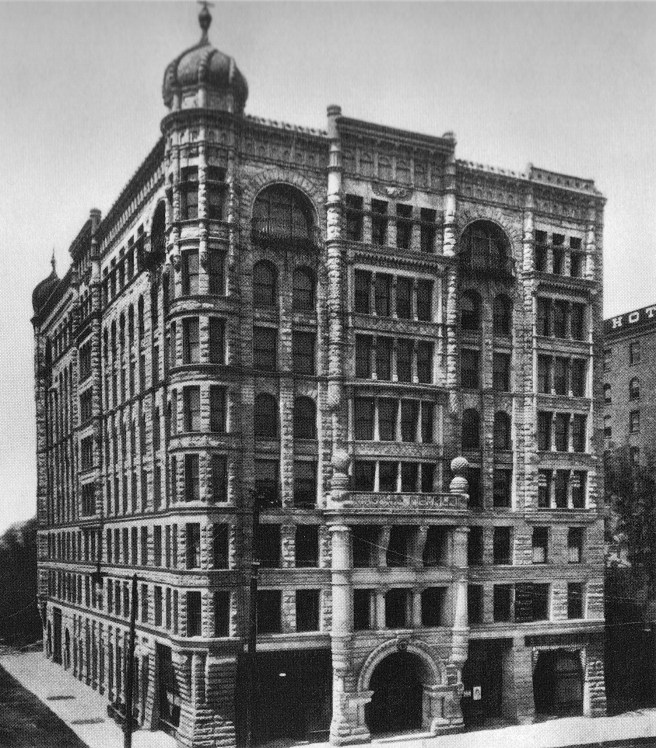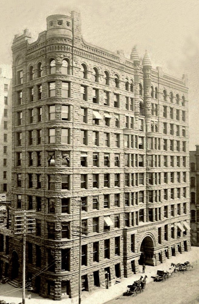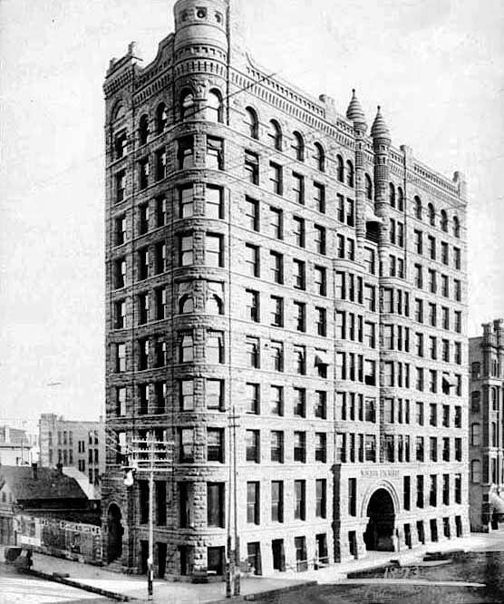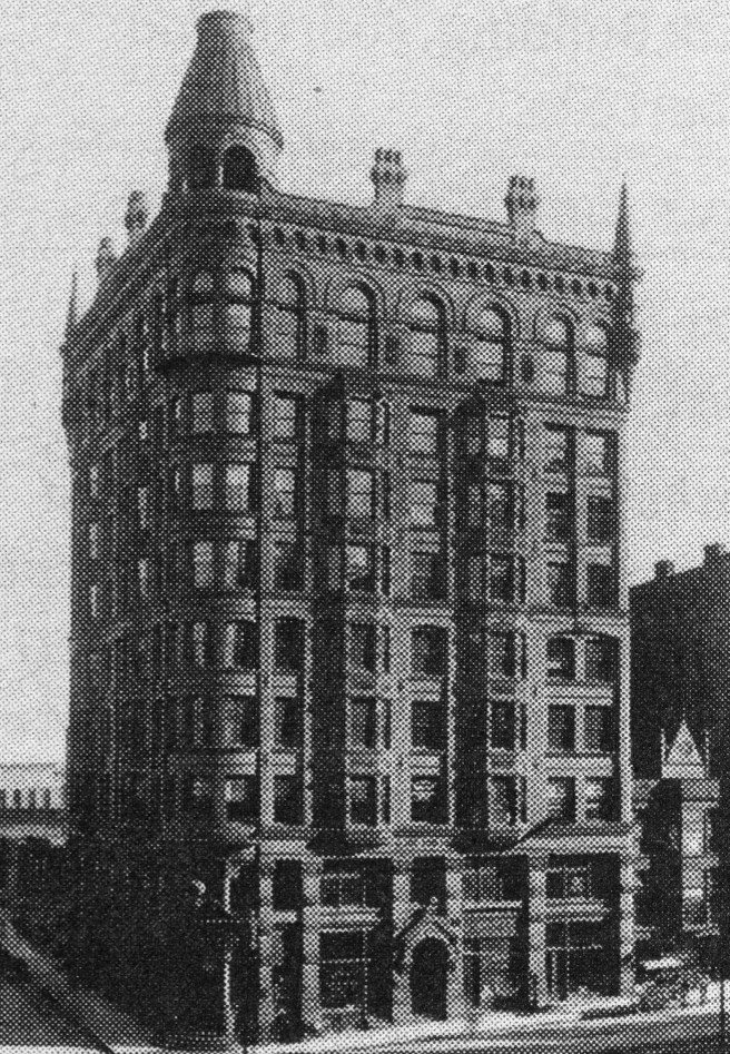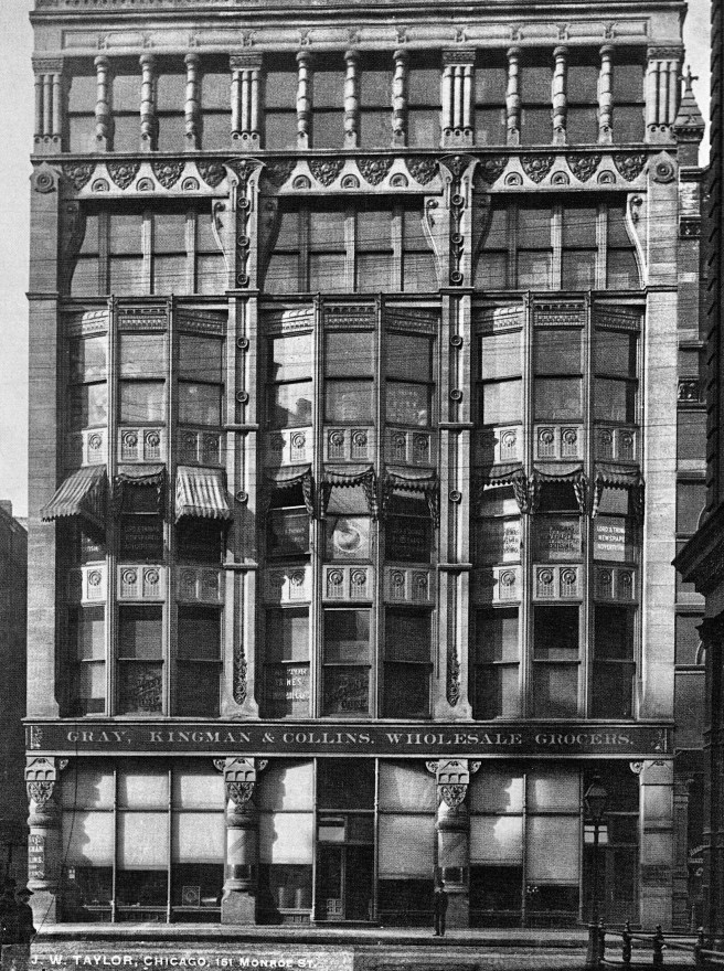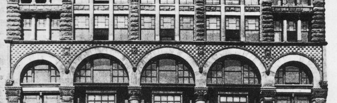 A very subtle difference from both Post’s and Richardson’s designs was in the detailing of the upper arcade that instead of grouping floors eight and nine into a two-story arcade by recessing the spandrel at the ninth floor, Ware cut the windows of each story into the smooth wall surface, thereby merging floors eight through ten into the “top”layer of his 3:4:3 layering that also allowed the arcade in the middle layer to be the dominant focus of the elevation. Ware used of a continuous sillcourse at the eighth floor (that Ware had stopped short of the corner pier à la the Field Store) that reinforced the boundary of this layer that was then broken at the ninth floor to allow the main structural piers to extend continuously for both floors. If for no other reason than this move in and of itself, I must credit Ware and not Sullivan for the design of this elevation, as this detail is simply too subtle to expect the inexperienced thirty-year old Sullivan to appreciate, let alone employ it.