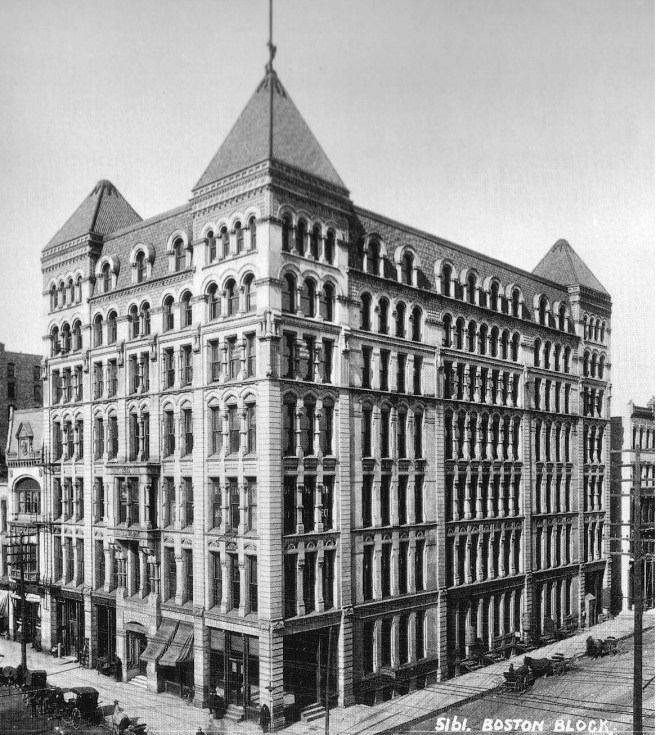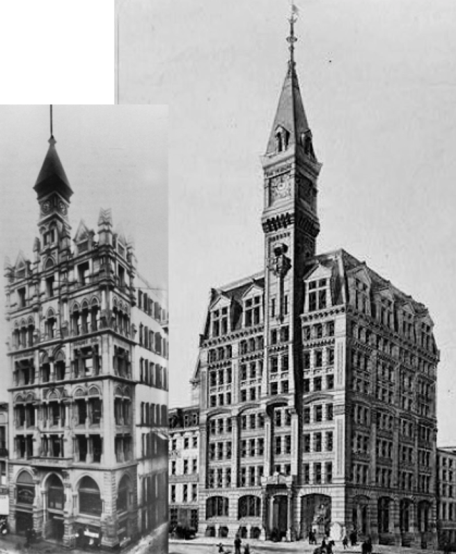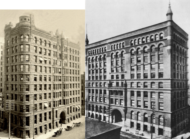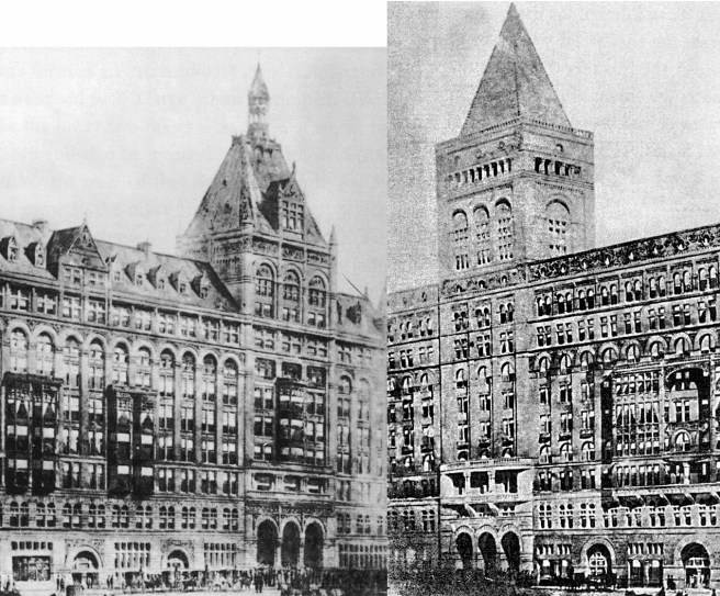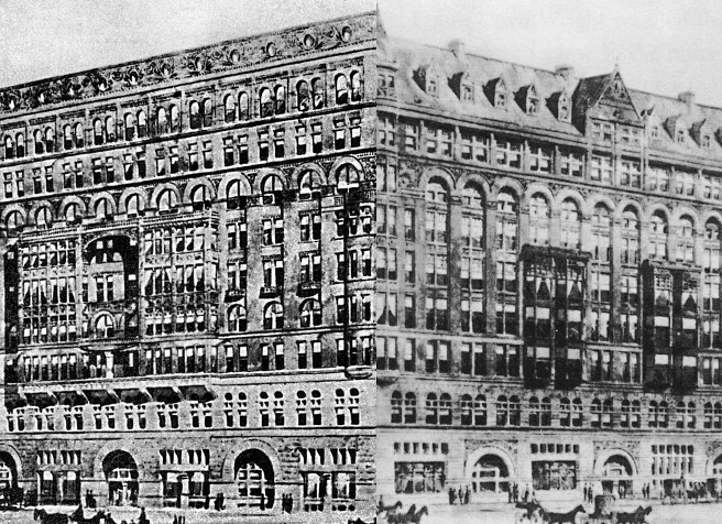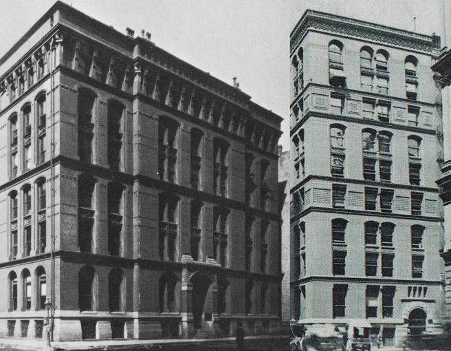 This latest design kept the two-story granite base but revised the third story transitional layer by extending the rock-face texture of the granite base into this story while being rendered with a darker stone or terra cotta to match the brick in the upper seven floors. Ware then revised the top seven floors into a layered progression of openings that was a masterful blend of the best of Post’s and that of Richardson’s designs. He used Post’s rhythm of 4:2:1 in the number of floors in each layer, while he incorporated a 1:2:3 ratio in the number of openings in each bay (even though both of his precedents had used a 1:2:4 ratio). Meanwhile, Ware rejected Post’s strict horizontal rhythms and kept Sullivan’s original use of Richardson’s technique of extending the rhythm of the main structural piers into the upper layers to give the building a counterbalancing vertical accent to the block’s dominant horizontal proportions.