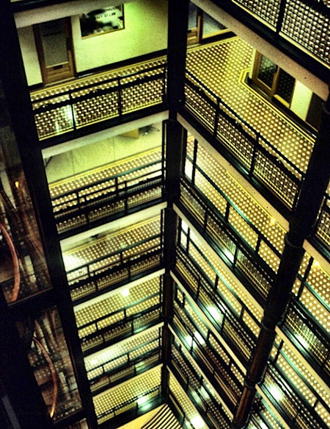 The dimensions of the site allowed Beman to line all four sides with single-loaded offices that left a 30′ by 40′ rectangular atrium in the center that extended for the entire height of the building’s 13 stories, the tallest atrium in the country. Beman detailed the conventional Hyatt glass prisms in the floors of each gallery to permit as much daylight to penetrate down into the lower floors.