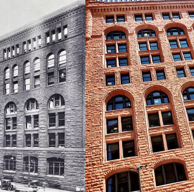 Sullivan composed the elevation into a layered 1:2:1 ratio. To accomplish this, he eliminated the stringcourse at the third floor à la Richardson’s example in the Field Store. He also used this project to experiment with two other details he had intended to use in the Auditorium: first, the ground floor employed a very similar treatment to what he had used in his first design, including curved cantilevered balconies at the corner. Second, he capped the façade with the fourth floor that on the Michigan elevation consisted of a redoux of the Auditorium’s triple window motif from his final design.