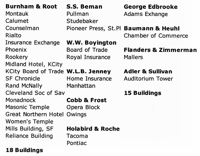 As I have shown, Sullivan in June 1889 was immersed in finishing the interior details of the Auditorium’s house in time for Opening Night, Dec. 9, 1889, a task he wouldn’t finish, including the remaining portions of the building until November 1890. Even by that date, he had yet to design a skyscraper. The facts are that all of Root’s skyscrapers were designed before Sullivan was commissioned to design his first skyscraper, the Wainwright Building in St. Louis. Historians, starting with Sullivan’s own Autobiography of an Idea, and codified by Condit have created a “false narrative” about Sullivan’s role in the development of the Chicago skyscraper. Root was the leading figure during the 1880s, and most likely would have continued to have been so, but for his premature death in January 1891. All of Sullivan’s skyscrapers were designed in the following decade, meaning that Sullivan had the advantage of learning from Root’s mistakes during the 1880s. (By no means take this as my dislike of Sullivan’s work. Remember, I stated in Vol. Two, Sec. 1.3 that his Chicago Stock Exchange was the quintessential Chicago School skyscraper. I simply want people to acknowledge the chronological fact that all of Root’s skyscrapers were designed before Sullivan’s Wainwright.) This is self-evident when I list the skyscrapers designed Chicago’s architects during the 1880s: