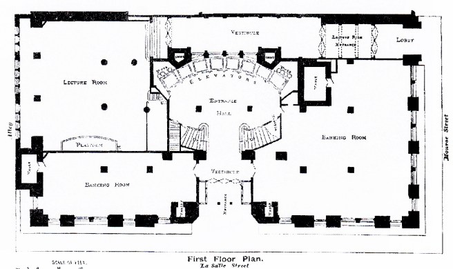 The vast majority of the building was dedicated to rented office space in order to help pay the cost of the annual $40,000 lease, nonetheless, there were various-sized rooms to provide space for the headquarters for the national, state, and local organizations. The project’s leader, Matilda Bradley Carse, had a vision of providing a variety of services and functions for the betterment of the city’s women. The most important space, however, was a 700-seat auditorium on the ground floor, that Carse had named Willard Hall, after the organization’s founder and national president, Miss Frances E. Willard. Similar to the Chicago Opera Block, Willard Hall had its own entry not from the building’s central rotunda, but located on Monroe Street.
