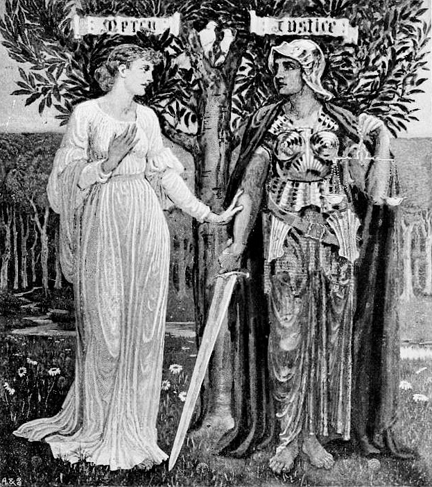 Root once again worked with William Pretyman and Walter Crane (the same Pre-Raphaelite jolly band that decorated Cleveland’s Society for Savings Bank: v.4, sec.5.3). The hall “was decorated with thirteen stained-glass lights and two rostral paintings commissioned from Walter Crane… Crane’s subjects [were] Temperance, Purity, Mercy, and Justice – all of which he represented by elongated female figures in the Pre-Raphaelite style of (Edward) Burne-Jones.” (I included a copy of Crane’s mural from the Society for Savings as an example of the colors Crane employed.)