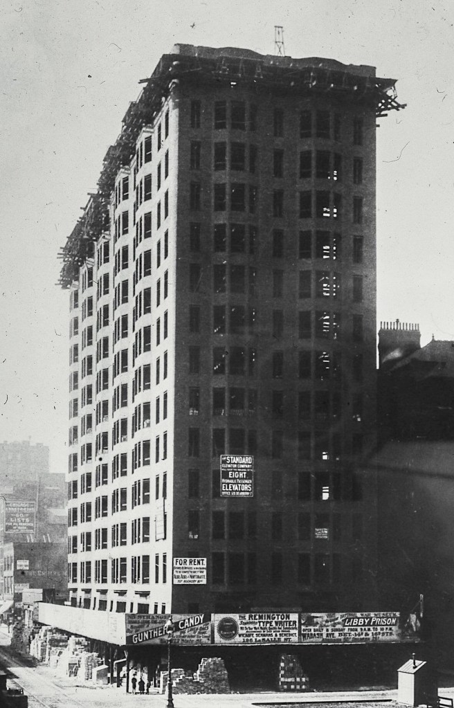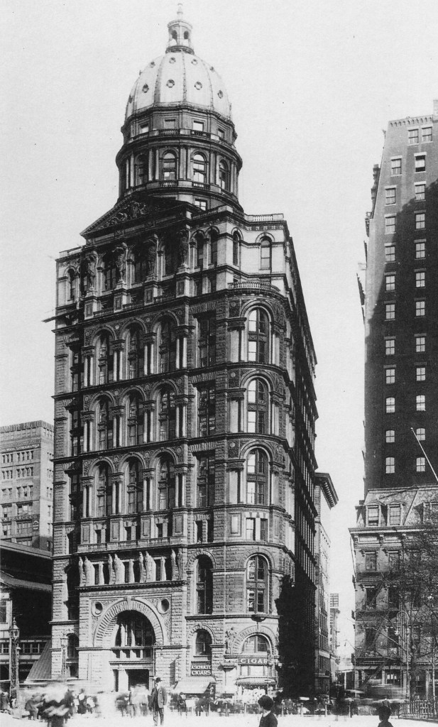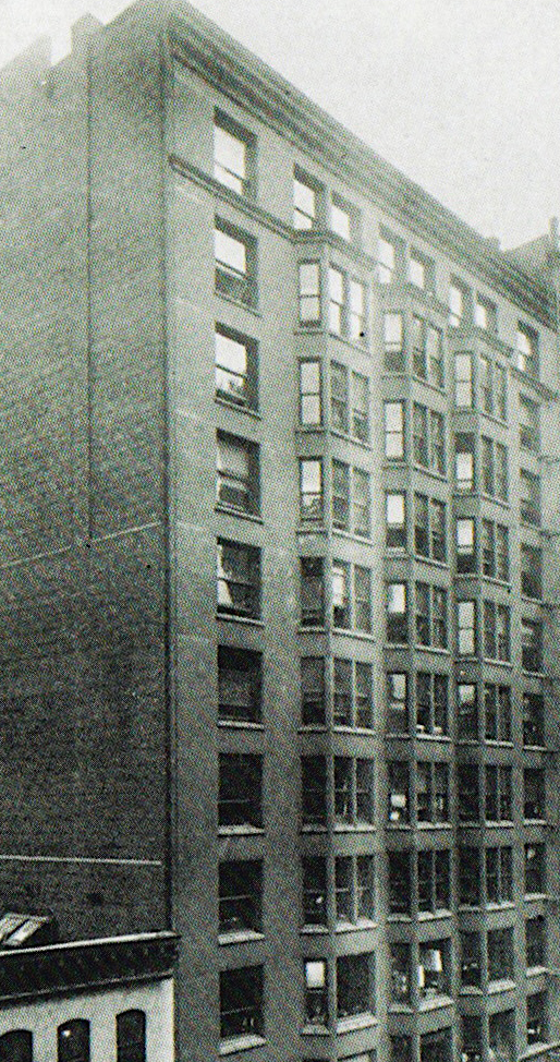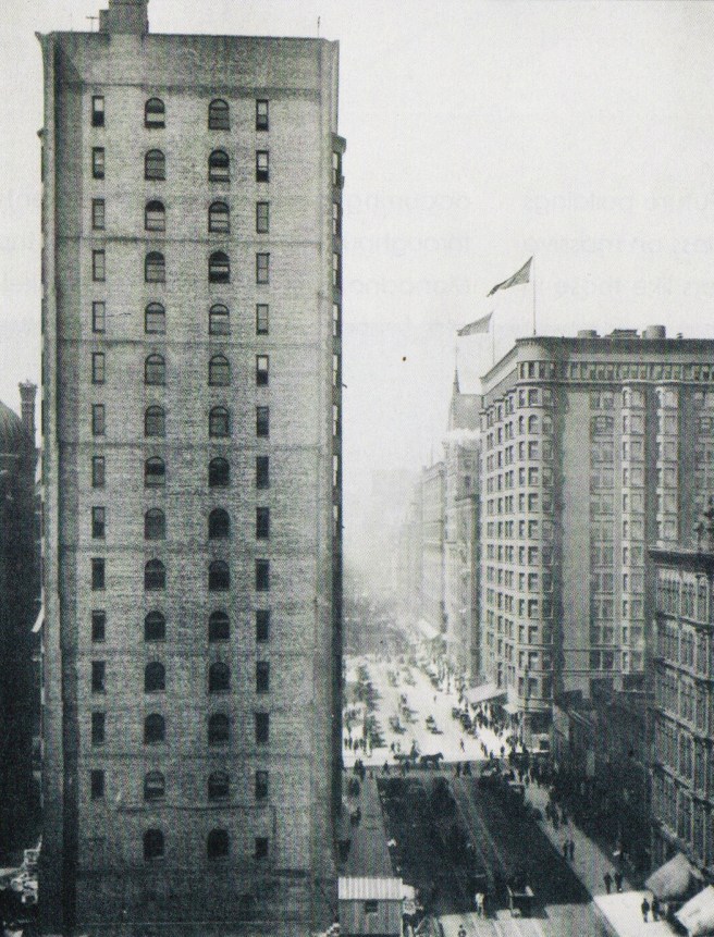 In its masonry bearing wall construction, the Woman’s Temple echoed the widely-spaced piered system used in the Monadnock. In its elevational design, it can be viewed as the twin sister of the Chicago Hotel (George Fuller was the contractor for all three), that was topped with a three-story, steeply-pitched, French châteauesque hat, including a hatpin that was a “70’ tall fleché of gilded bronze, surmounted by the beautiful form of a woman, with face upturned and hands outstretched to heaven in prayer… as she protests against laws and customs of the nation… and appeals unto God for help to save her home, children, and land from (liquor’s) destroying power.” (Judging by the appearance of the fleché, Root may have been inspired by the spire of Mont Saint-Michel, but can there be any doubt that its true reason for being was a parry to Stanford White’s Diana planned to cap the tower of Madison Square Garden?)